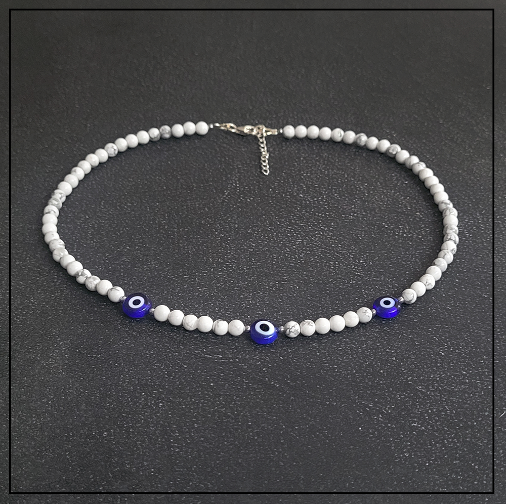 Opis produktu: Ręcznie robiony naszyjnik z kamieni naturalnych z motywem evil eye.