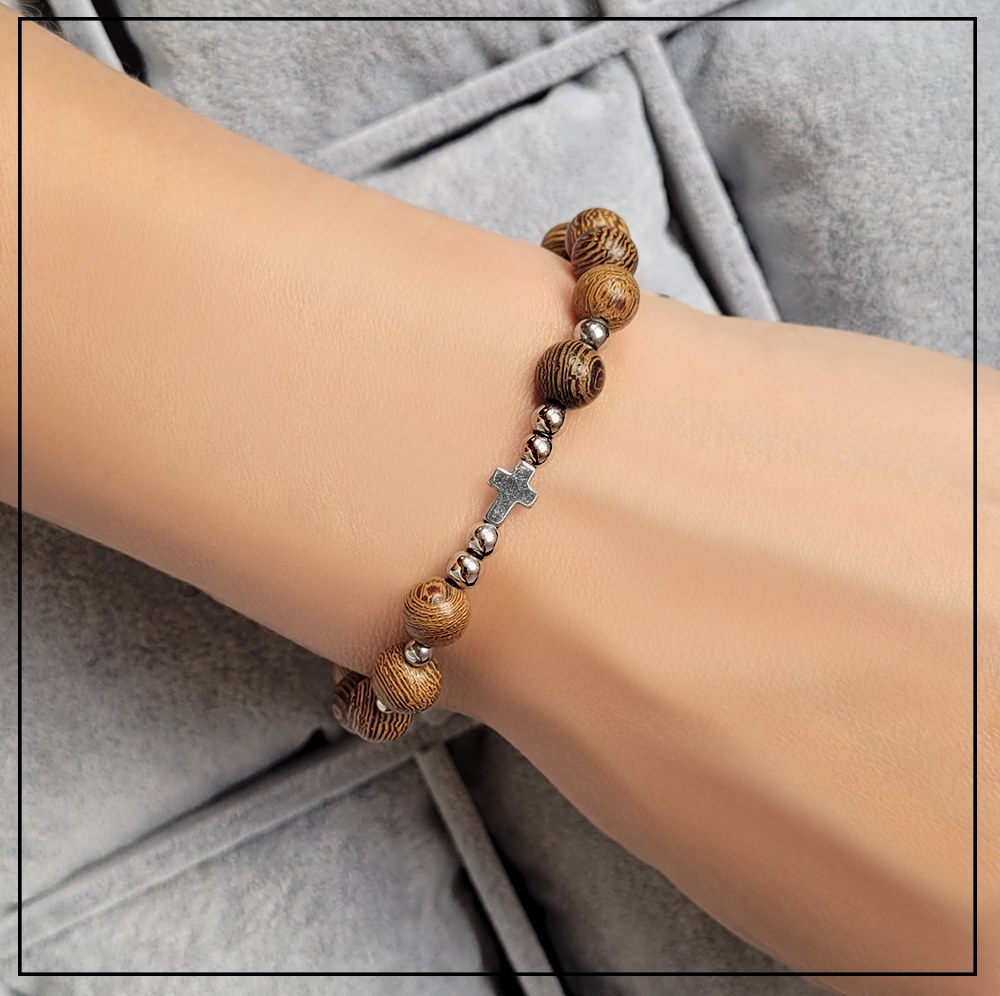 Opis produktu: Elastyczna bransoletka różaniec z kamieni naturalnych i drewna na gumce.