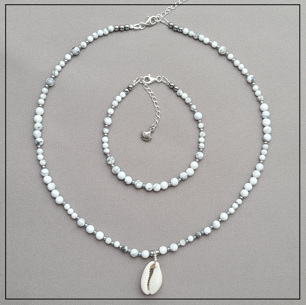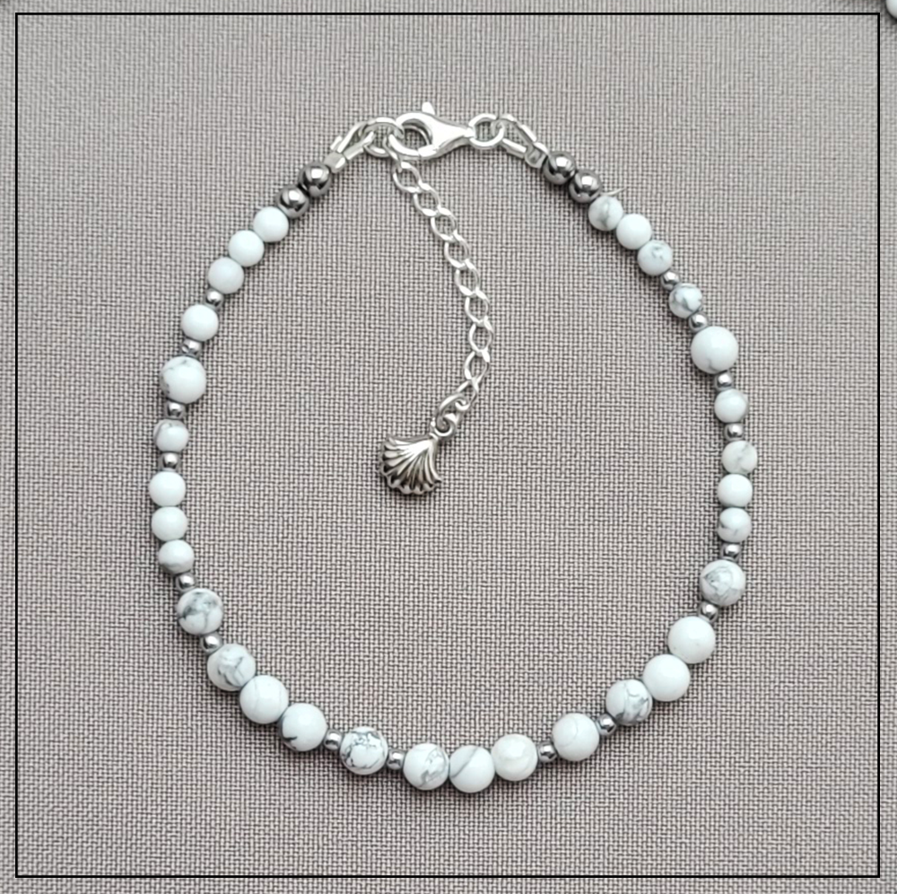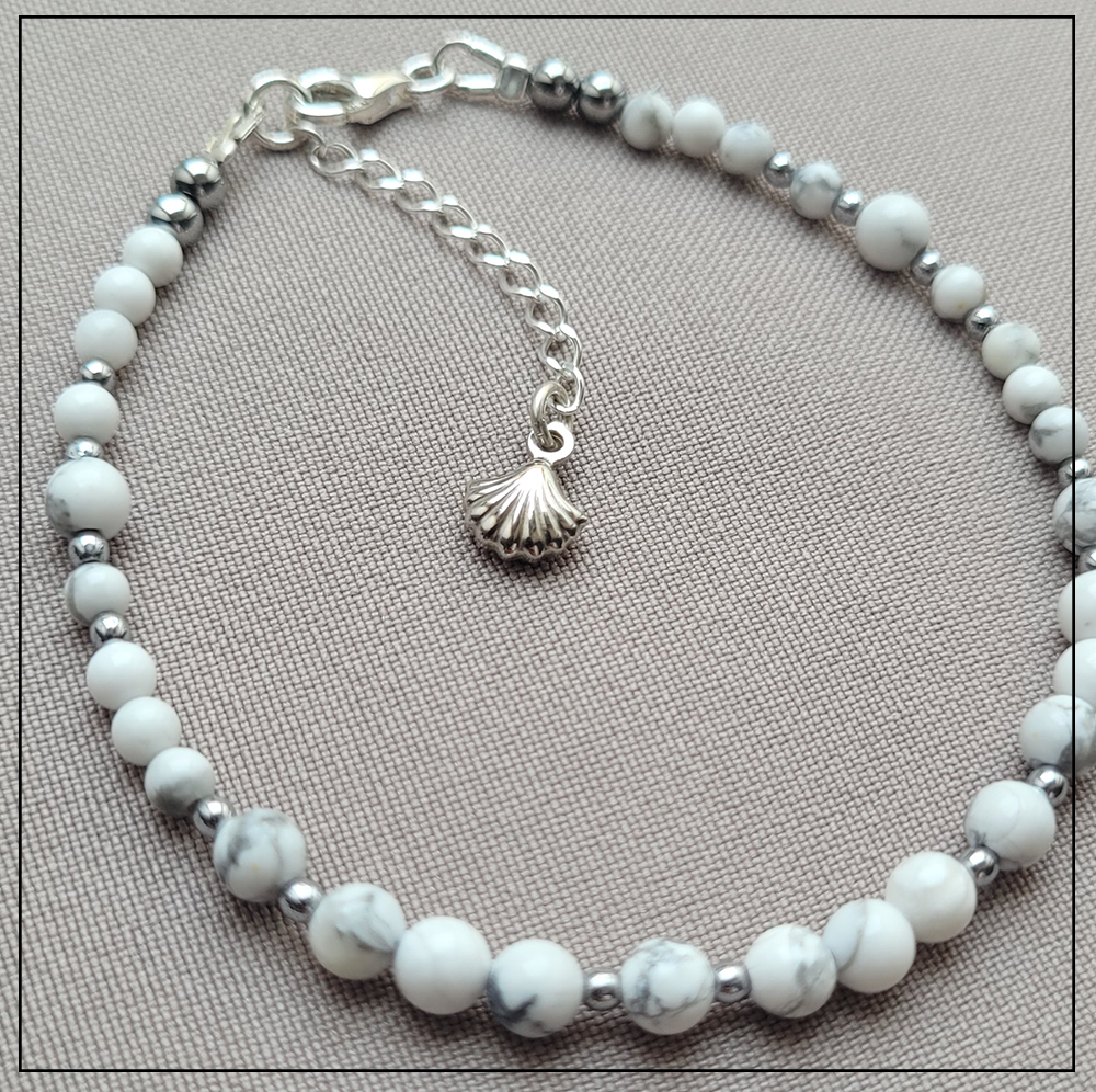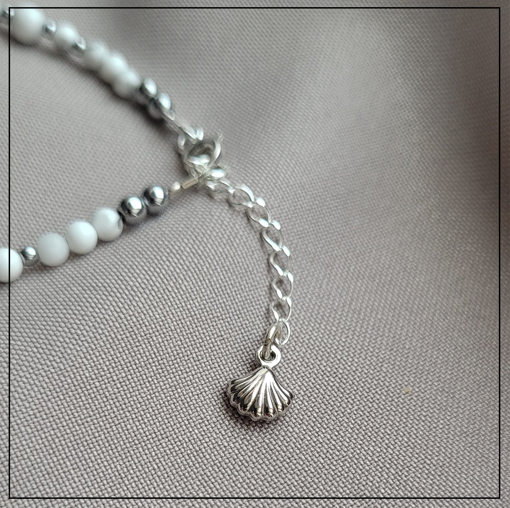 Opis produktu: Bransoletka z kamieni naturalnych nawleczonych na żyłkę z pozłacanym zapięciem i zawieszką w kształcie muszelki.