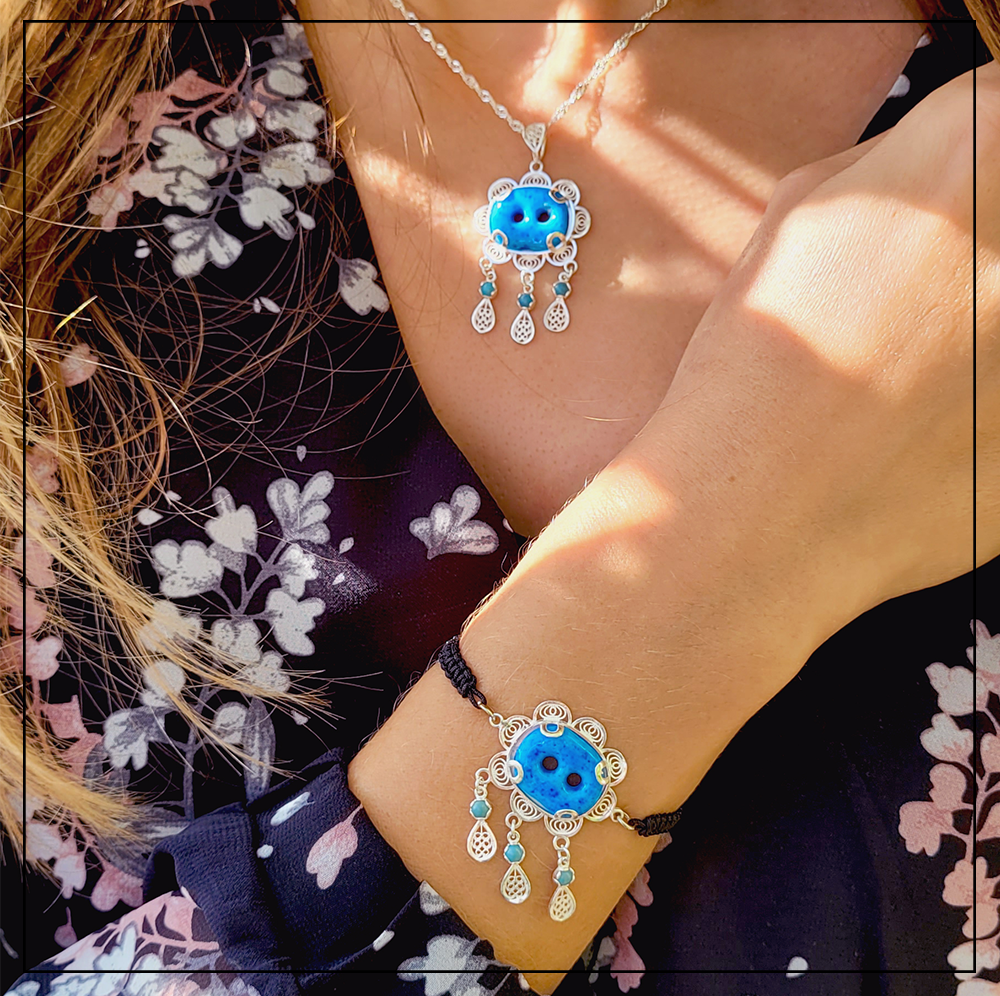 Asyryjska biżuteria wykonana z turkusowego kamienia oprawionego w srebro to talizman znany w regionie południowo-wschodniej Turcji ze swoich właściwości ochronnych. Talizman z dwoma dziurkami symbolizuje dwoje oczu i chroni przez złą energią oraz urokiem. Natomiast ten z siedmioma dziurkami symbolizuje 7 wród do raju. Przynosi szczęście, miłość, spokój, zdrowie i pieniądze. Według ludowych wierzeń najlepiej nosić go w widocznym miejscu, aby w ten sposób chronił posiadacza przez złą energią bijącą od innych ludzi.
