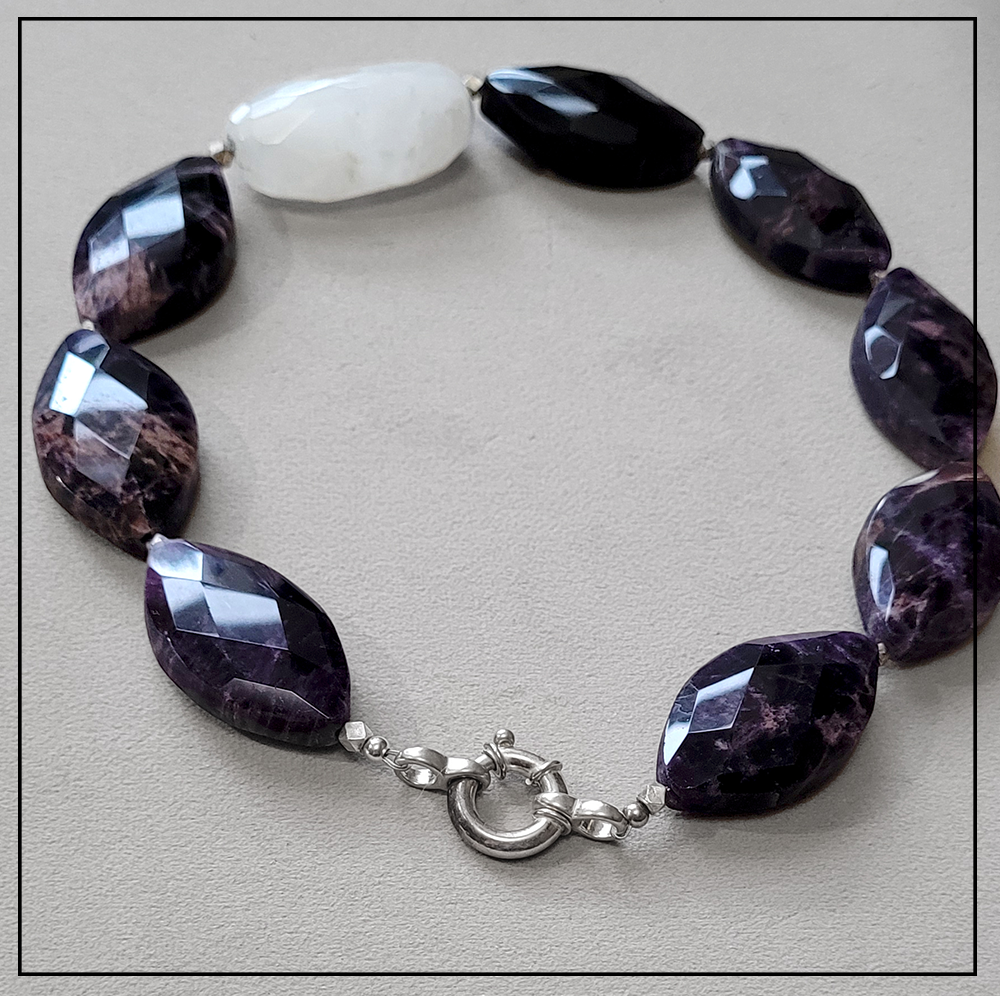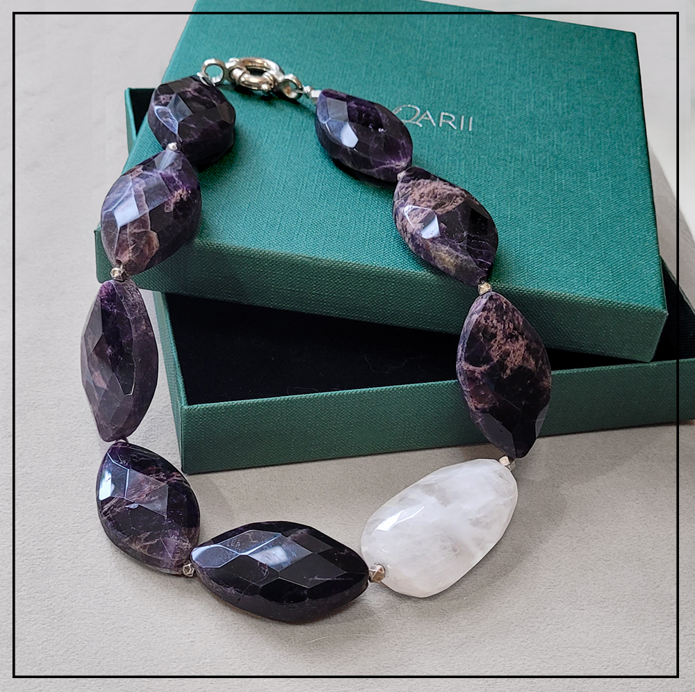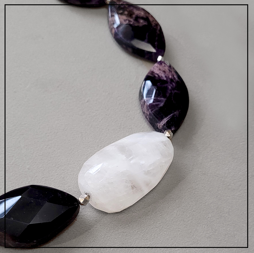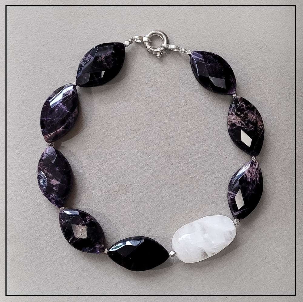 Materiał: Srebro 925, lepidolit, kwarc mleczny.