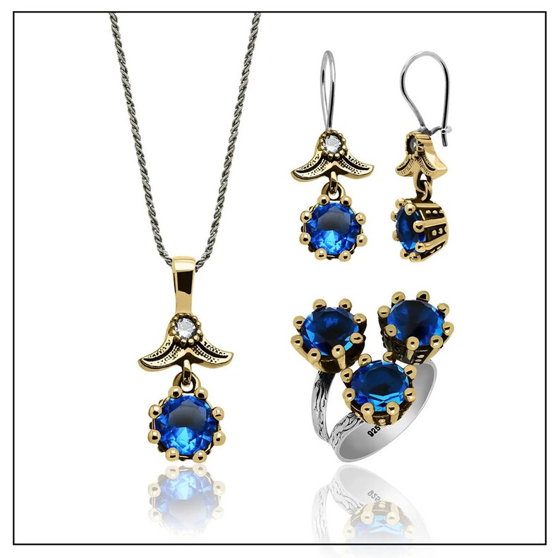 Opis produktu: Komplet składa się z kolczyków, pierścionka oraz zawieszki z łańcuszkiem.