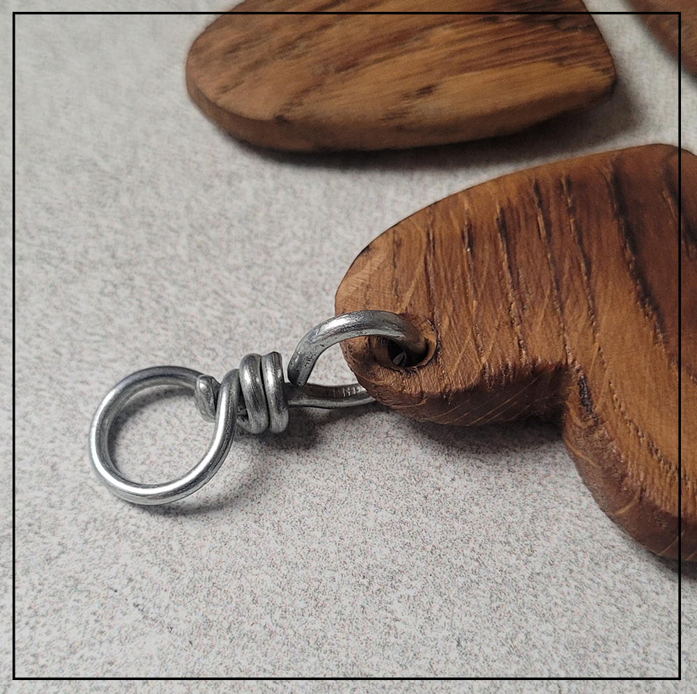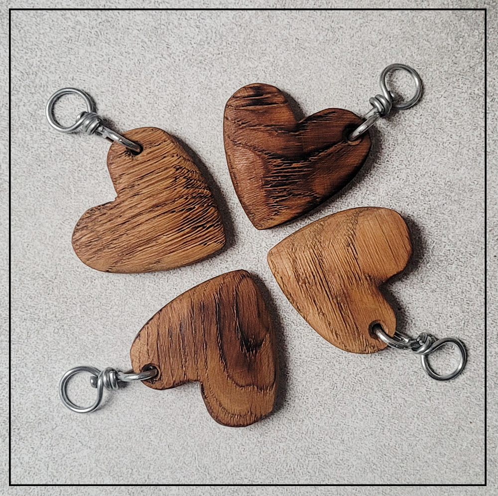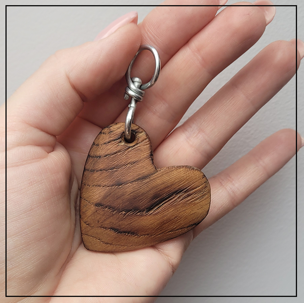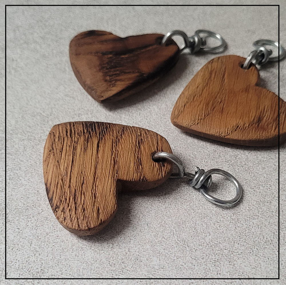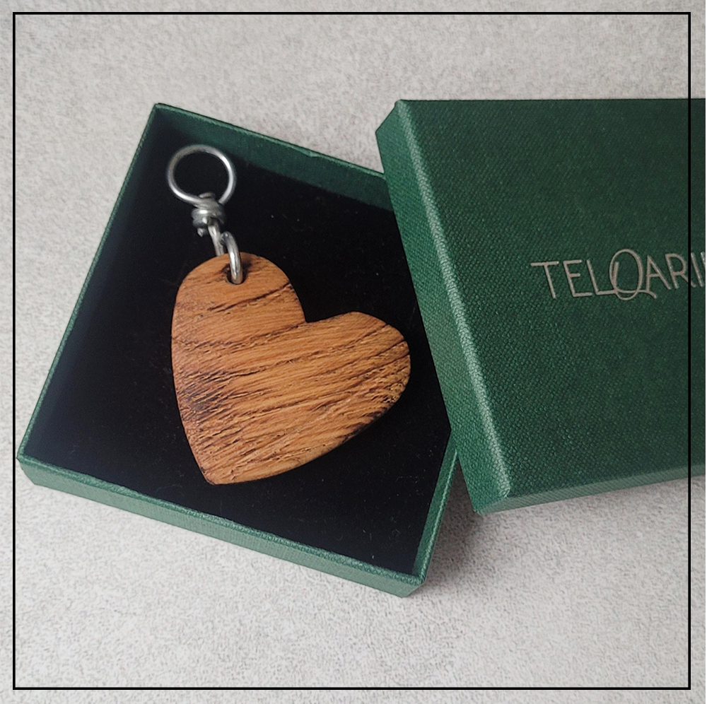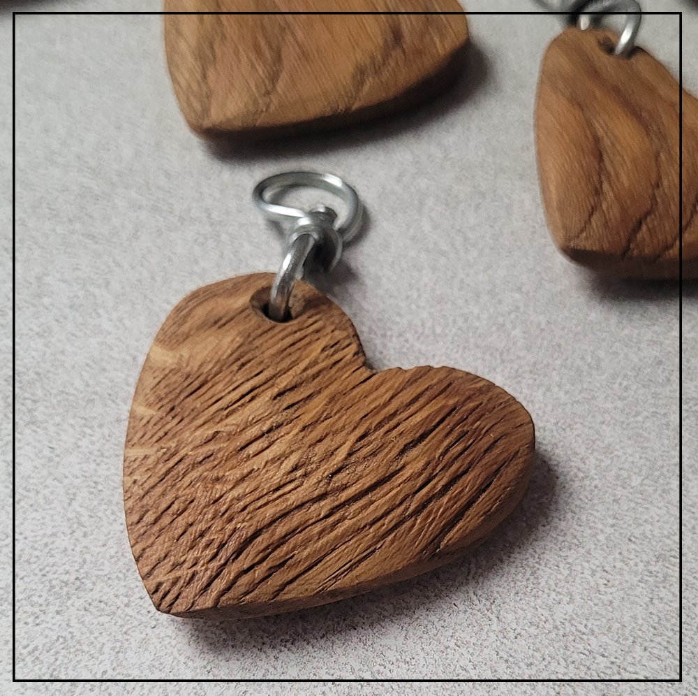 Brelok w kształcie serca wykonany z drewna dębowego jest rękodziełem i dlatego każdy egzemplarz może się lekko różnić odcieniem drewna, układem słoi oraz kształtem.
