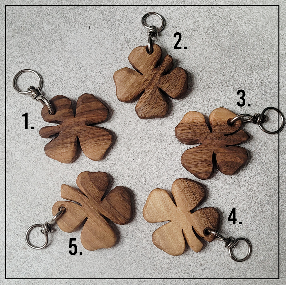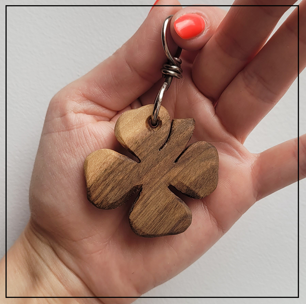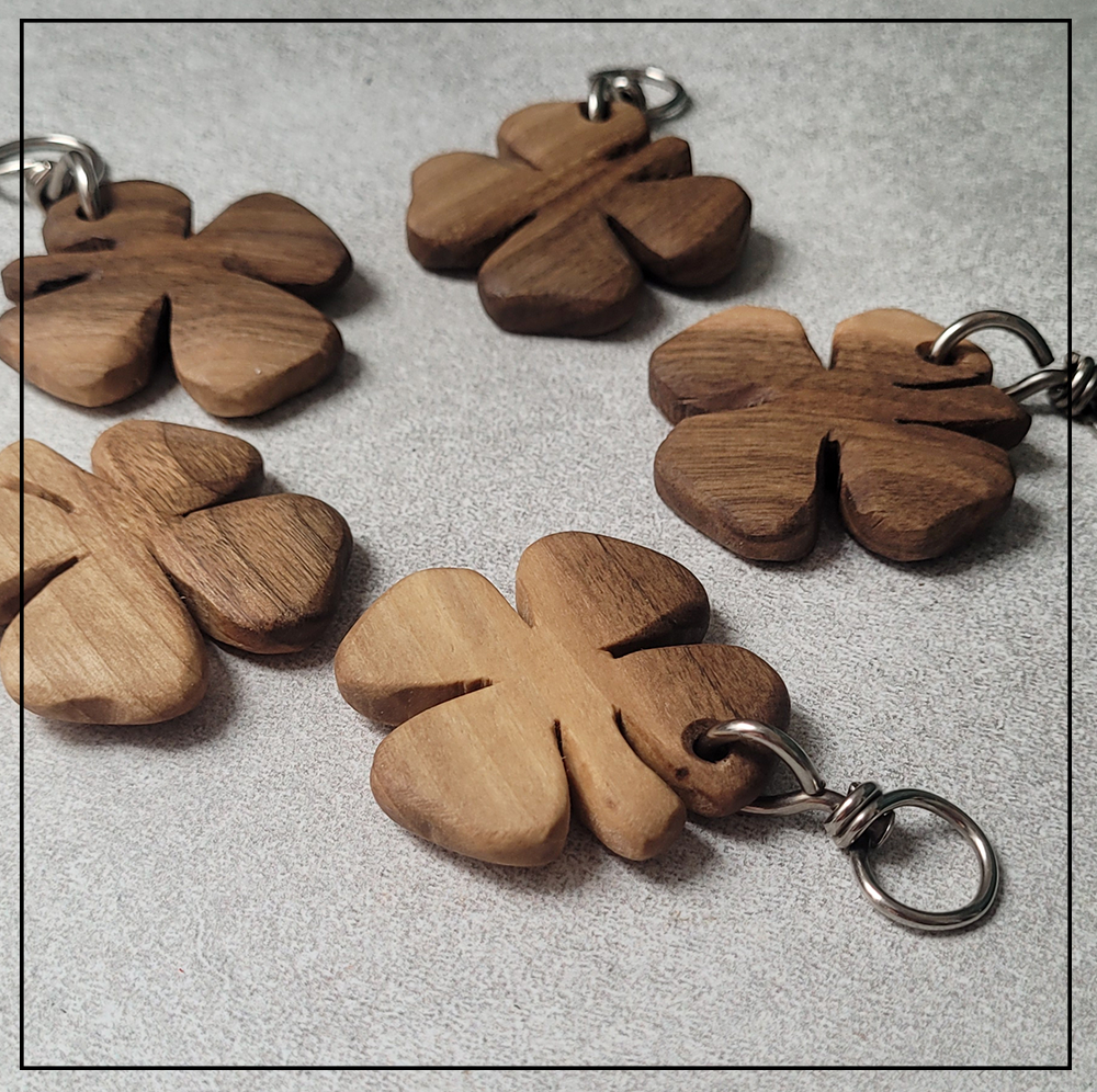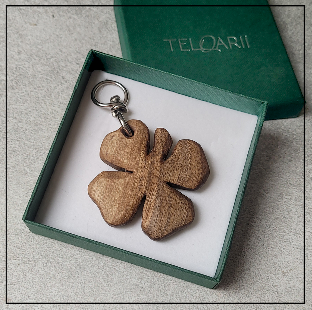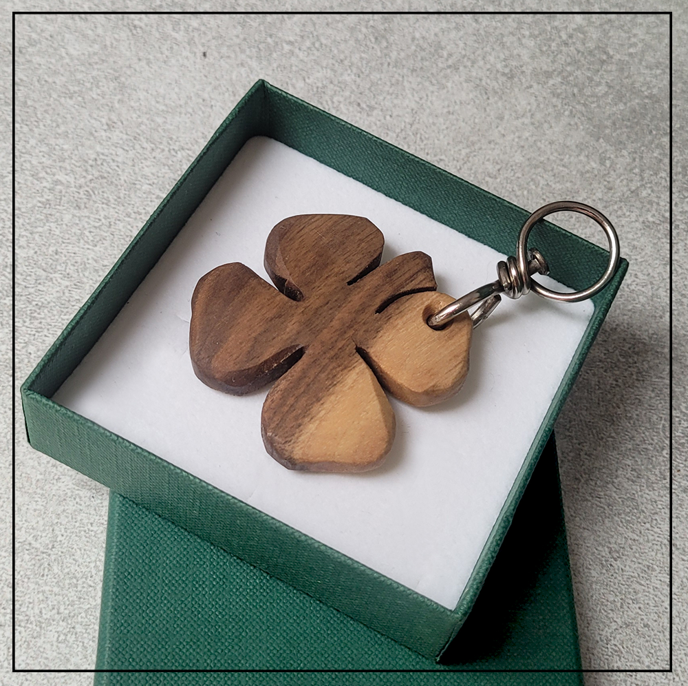 Brelok w kształcie koniczyny wykonany z drewna akacjowego jest rękodziełem i dlatego każdy egzemplarz może się lekko różnić odcieniem drewna, układem słoi oraz kształtem.