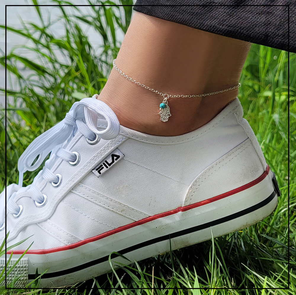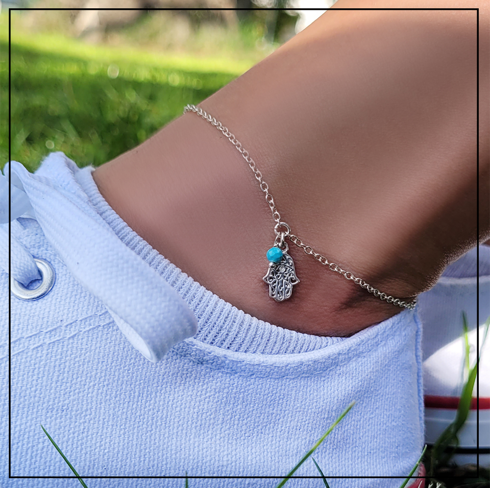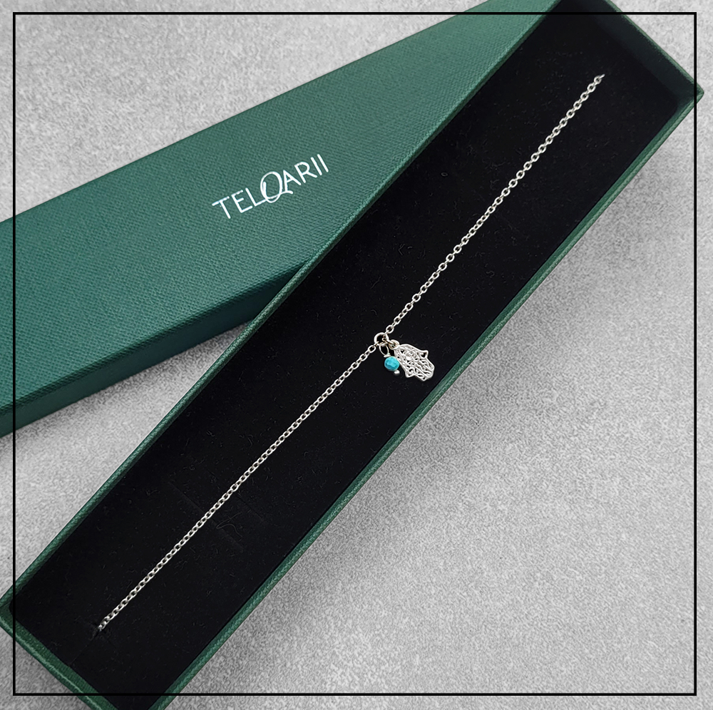 Opis produktu: Bransoletka składa się z łańcuszka oraz zawieszki z Chamsą i magnezytem.