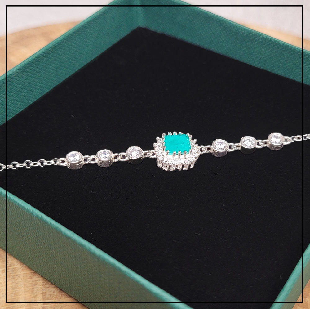 Opis produktu: Bransoletka składa się z łańcuszka oraz motywu z turmalinem i cyrkoniami.