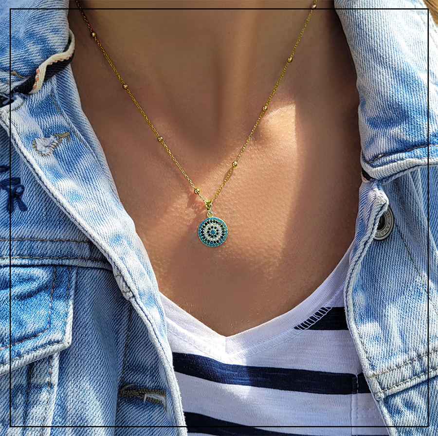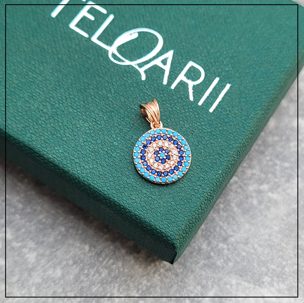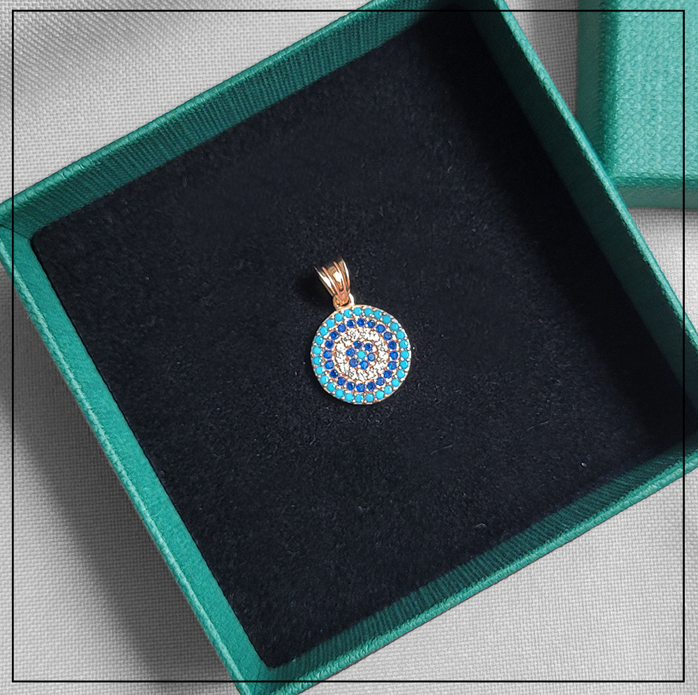 Opis produktu: Pozłacana zawieszka w kształcie koła z motywem evil eye wysadzanym cyrkoniami.